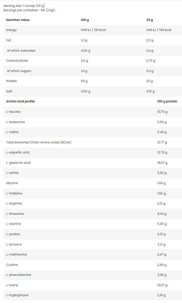• 100% суроватъчен протеин изолат за бърза абсорбция и чист състав