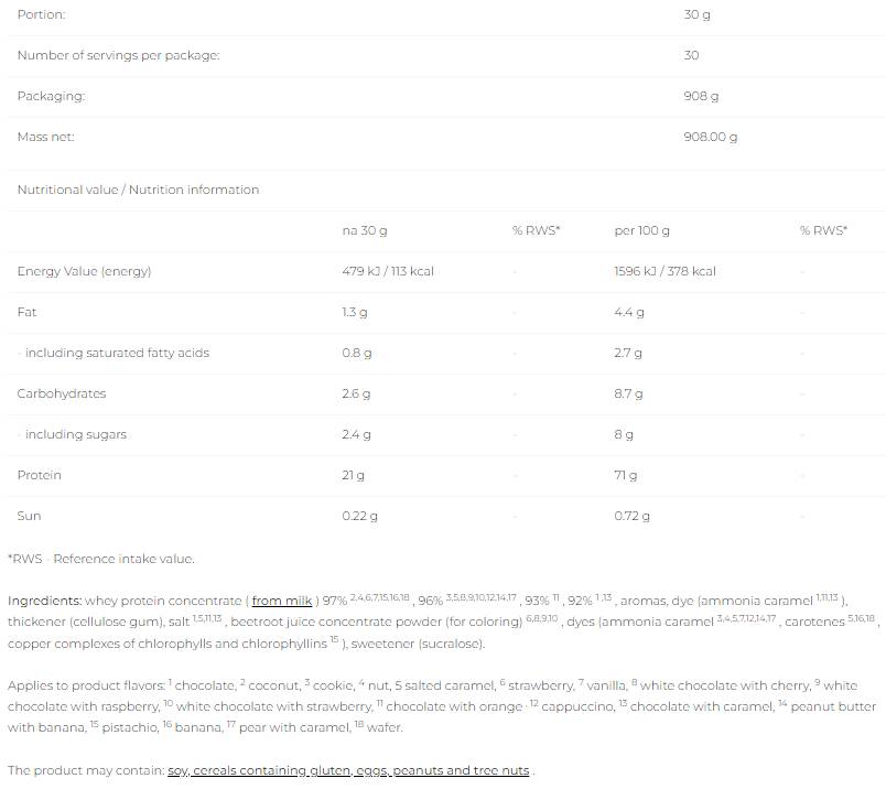 • Превъзходен аминокиселинен профил: Висококачественият суроватъчен протеин концентрат (WPC) осигурява всички необходими аминокиселини.