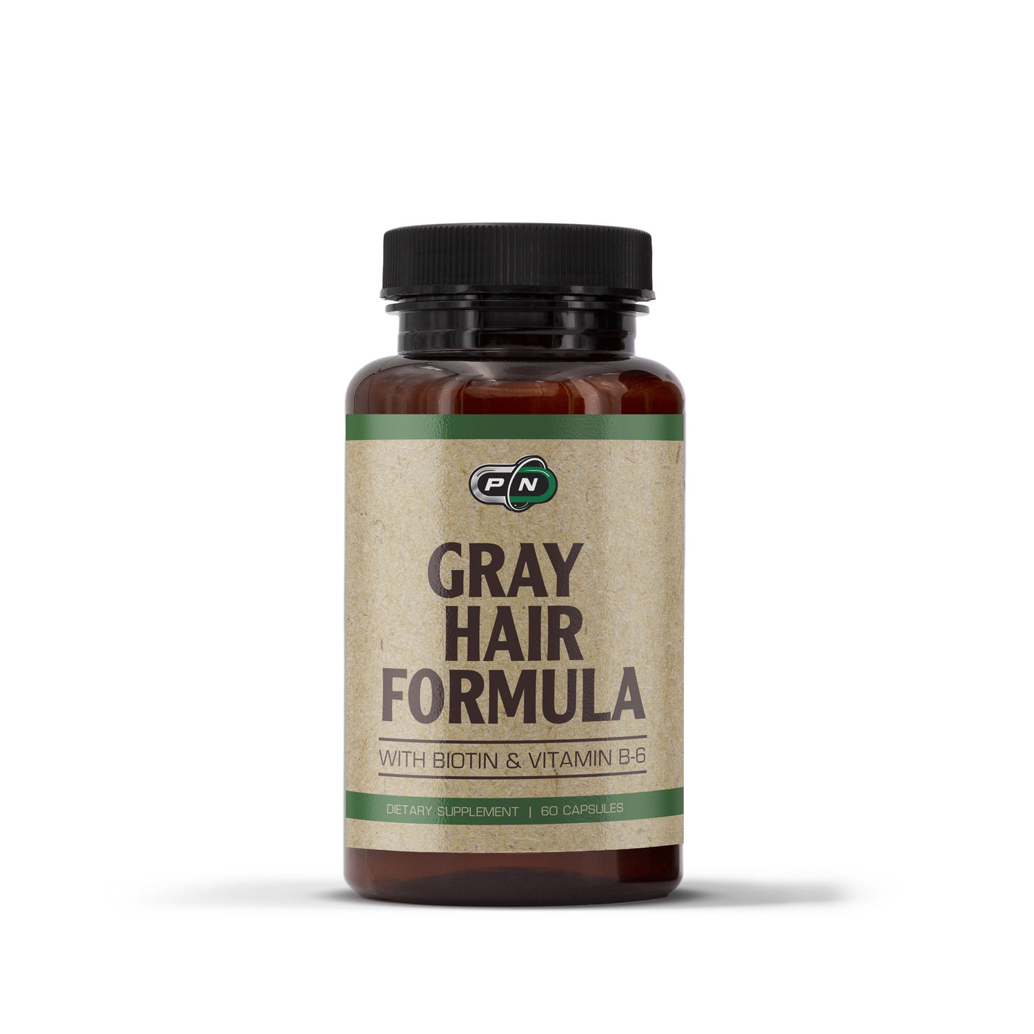 Pure Nutrition GRAY HAIR FORMULA е здравословна хранителна добавка, която намалява появата на бели коси и подпомага репигментирането на естествения цвят.