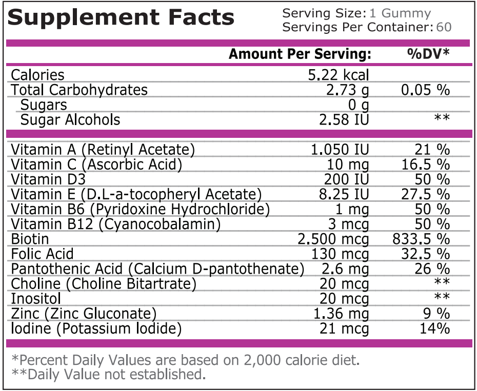 Формулата съдържа комплекс от важни витамини и минерали като Витамин А, Витамин C, Витамин D3, Витамин E, витамини от B група, цинк и йод. Тези съставки работят синергично за поддържане на естествената красота на косата, еластичната кожа и здрави нокти, както и за подкрепа на имунната защита и енергийните нива.