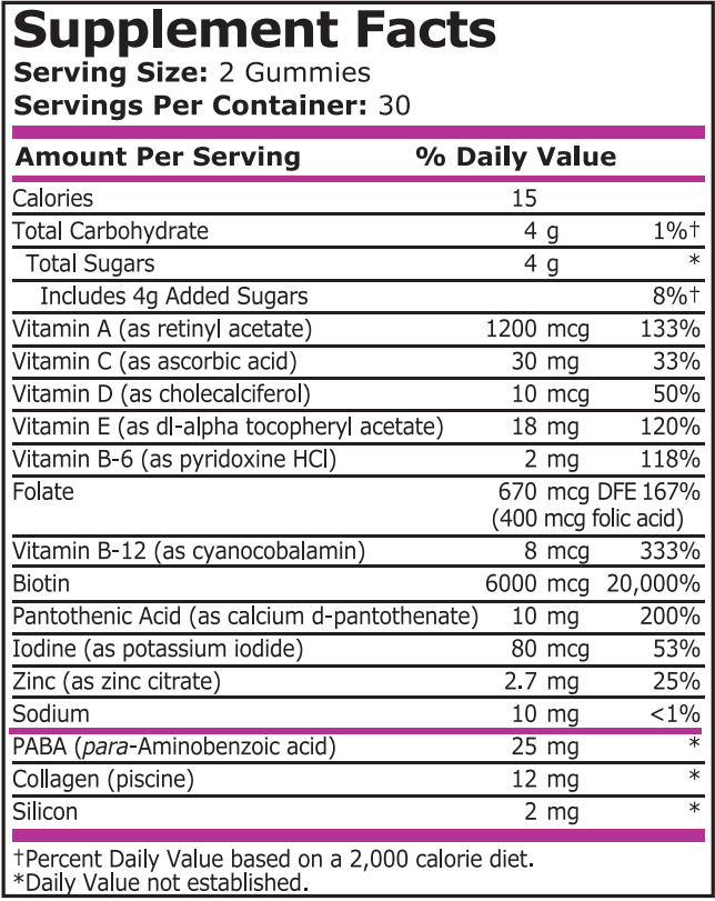 Съставът включва витамин А за поддържане на кожата и регенерацията, витамин C за образуване на колаген, витамин D за здравето на фоликулите и скалпа, витамин Е за защита на кожата, витамини от B групата, биотин, цинк, йод, колаген и PABA. Тази комбинация подпомага визията на косата, кожата и ноктите, подпомага детоксикацията и имунната защита, и не съдържа глутен и желатин, с плодово ухание на маракуя и без изкуствени овкусители.