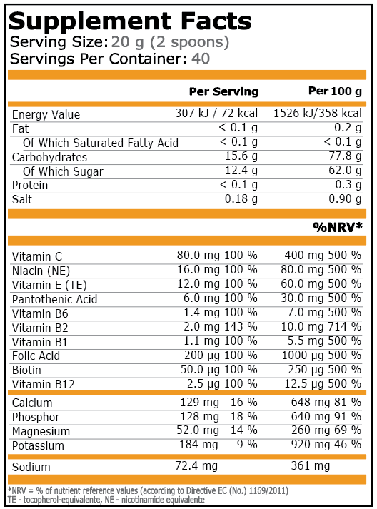 Съдържа комбинация от бързи и бавни въглехидрати, което осигурява енергия за продължителен период и поддържа стабилно ниво на кръвната захар по време на тренировка. Минералите, изгубени с потта, се възстановяват по време на упражненията, подпомагайки нормалното функциониране на мускулите и нервната система. Според клинични изследвания атлети, които приемат изотонични напитки по време на тренировка, могат да очакват подобрения до 20% в резултатите.