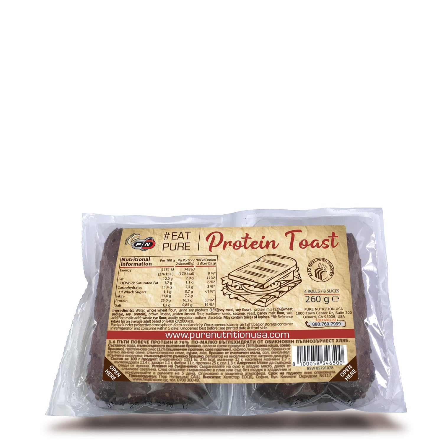 PROTEIN TOAST от Pure Nutrition е хляб за сандвичи, който съдържа почти 4 пъти повече протеин от обикновения пълнозърнест хляб и 76% по-малко въглехидрати. Това го прави подходящ избор за всеки активен човек, който иска качествени въглехидрати и протеин в диетата си. В пакет се съдържат 4 прецизно нарязани хлебчета, готови за консумация по всяко време и на всяко място.