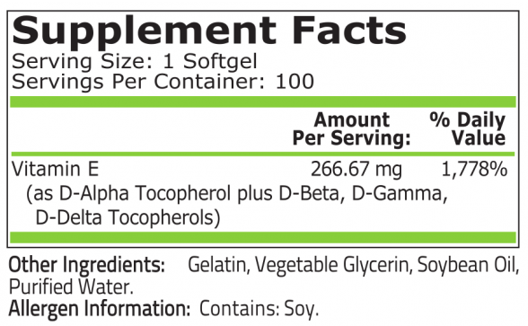 Продуктът е предназначен за поддържаща хранителна добавка към ежедневното меню, с цел да подпомогне естествените защитни механизми на организма. Със своя антиоксидантен профил, витамин Е може да бъде полезен при нужда от подкрепа на организма и подпомага регенерацията на тъканите, като се споменава особен интерес към подобряване на предменструалния синдром и подкрепа при фиброзни заболявания на гърдите. Витамин Е забавя стареенето и намалява появата на пигментации по кожата с времето.