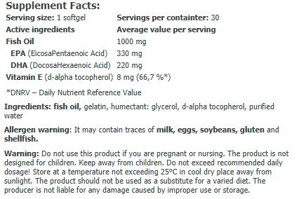 Рибеното масло доставя EPA и DHA, които подпомагат нормалното функциониране на мозъка, зрението и кожата, като същевременно допринасят за здравословното ниво на мазнини в организма. Витаминът Е в формулата осигурява антиоксидантна защита и помага за запазване качеството на маслото. Продуктът има мощни противовъзпалителни свойства и може да подпомогне естествения метаболизъм на мазнините. Една доза е 1 софтгел, опаковката съдържа 90 дози. Съставки: рибено масло, желатин, овлажнител глицерол, d-алфа токоферол, пречистена вода.