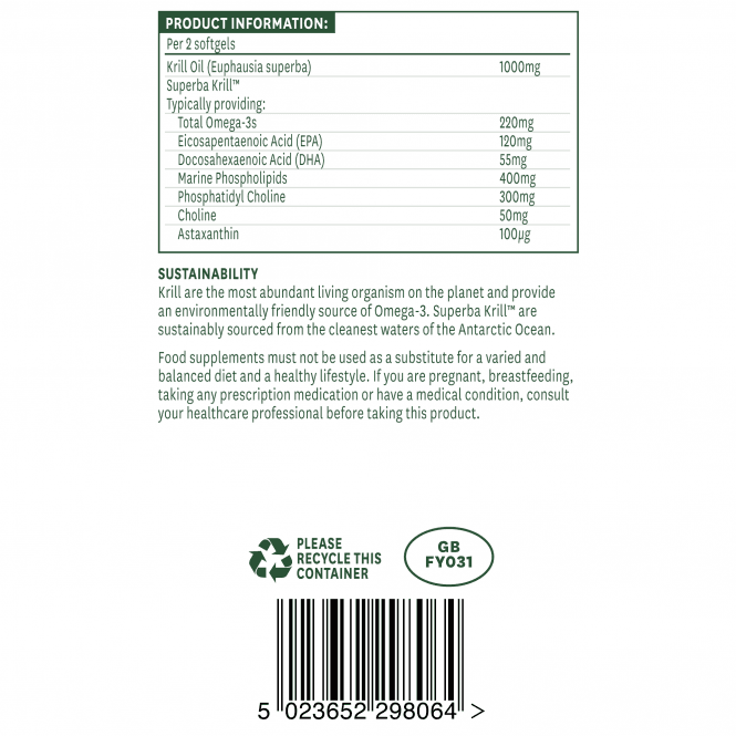 Natures Aid Antarctic Krill Oil Superba е извлечен от зоопланктон от най-чистите води в Антарктическия океан и е сертифициран от Британския съвет за Устойчиво Развитие на Морските Басейни. Меки капсули без вкус, без мирис и лесни за преглъщане. Маслото от крил е отличен източник на омега 3 мастни киселини, включително EPA и DHA. Отличава се с висока концентрация на фосфолипиди, което го прави лесно за употреба от тялото, по-малко от рибеното масло, тъй като като цяло омега-3 мастни киселини в рибеното масло се съхранява под формата на триглицериди. Маслото от крил съдържа фосфатилхолин и астаксантин. Фосфатидилхолинът е основният фосфолипид в човешкия организъм, градивен елемент на клетъчните мембрани. Участва в редица процеси в тялото, като транспортирането на мазнините от черния дроб към кръвния поток. Подпомага състоянието на черния дроб и функциите му. Астаксантинът е естествен каротеноид, който поради своята уникална структура осигурява широк спектър от антиоксидантни ползи. Тъй като астаксантинът е в състояние да премине през кръвно-мозъчната и кръвно-ретината бариери, той може да осигури мощна антиоксидантна защита директно на очите, мозъка и нервната система. Противовъзпалителните свойства на омега-3 мастните киселини предпазват от сърдечно-съдови заболявания, рак, диабет тип 2. Подобряват циркулацията на кръвта в организма, понижават лошия холестерол и кръвното налягане, подпомагат здравето на ставите.