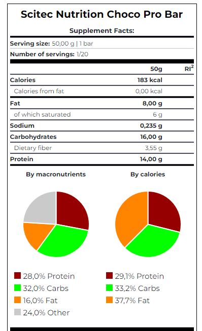 SCITEC Choco Pro Bar Box / 20 x 50 g е изключително вкусен протеинов бар, който ефективно засища глада и повишава енергията, независимо къде се намирате. С високото съдържание на протеин, този продукт предоставя на тялото необходимите хранителни вещества за правилно изграждане и възстановяване на мускулна маса. Ниското съдържание на захар е допълнителен плюс за онези, които се грижат за своето здравословно хранене. С покритие от истински шоколад и мека текстура, SCITEC Choco Pro Bar е идеалното здравословно изкушение, от което имате нужда.