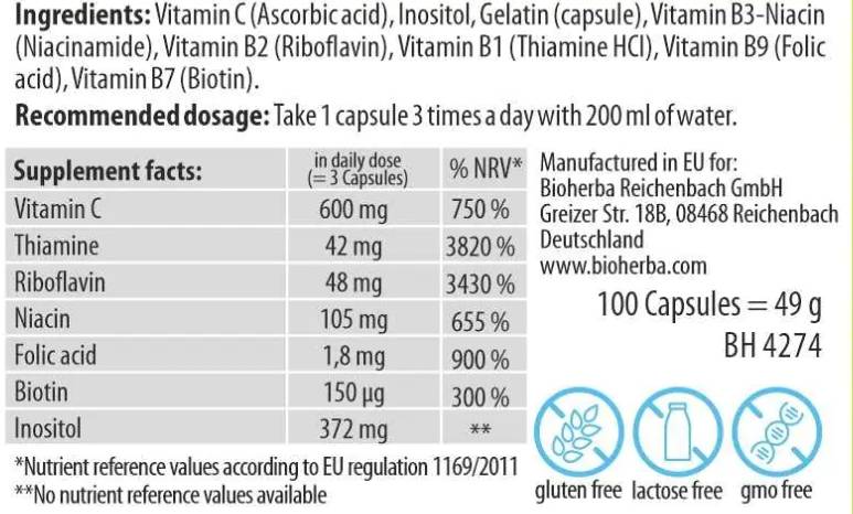 С уникална комбинация от витамини B и C, продуктът подпомага нормалното функциониране на нервната система, енергийната устойчивост и устойчивостта на стрес. Подходящ е за хора под напрежение и за тези, които търсят подкрепа за дневния ритъм. Витамин C допринася за имунната защита и за антиоксидантния защита, докато B-витамините съдействат за метаболизма на енергията и психичното благосъстояние. Формулата е проектирана за лесна усвоемост и удобен дневен прием в капсула.