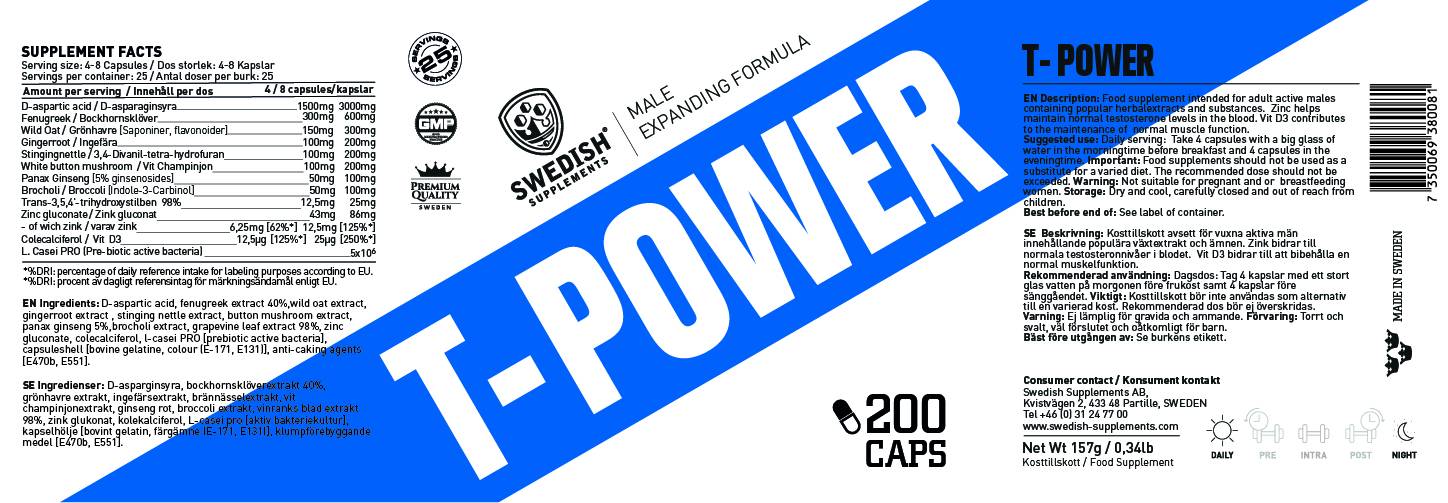 Посочените по-горе компоненти представляват само една част от всички съставки, които правят T-Power истински победител сред Тестостернонните стимулатори. Като 'черешка на тортата': Swedish Supplements са добавили нужните количества Цинк и Витамин D като и двете имат голяма роля за осигуряване на контролирано производство на Тестостерон.