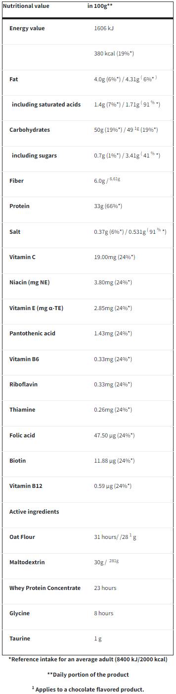 Trec Boogie Oat Gainer - Съставът е богат и на много важни за човешкия организъм и неговото функциониране - диетични фибри. Има редица ценни свойства, включително раздуване на стомаха, което се изразява в неговото запълване и по този начин ограничава ненужния апетит и усещането за постоянна празнота. Разбира се, не се усвоява, така че не повишава общата калорична стойност на храната. Трябва също така да се помни, че правилното му набавяне е от голямо значение за правилното функциониране на храносмилателната система и по-специално за чревната перисталтика. Както можете да видите, това е един много добре балансиран продукт, чиято формула се основава на внимателно подбрани хранителни вещества. Не инвестирайте в полумерки и изберете BOOGIE OAT GAINER.