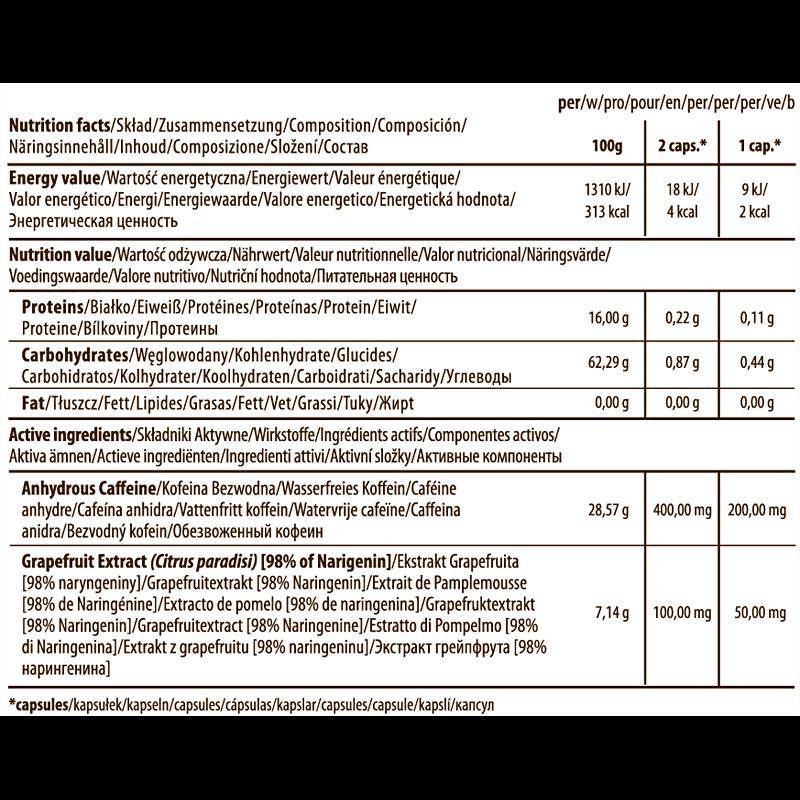 Caffeine 200 Plus е изключителен продукт, който стимулира цялото тяло да подобри физическата си и умствена дейност. Неговата формула използва синергията на действие на най-висококачествен безводен кофеин и силно концентриран нарингенин, добит от стандартизиран екстракт от грейпфрут (Citrus paradisi). Добавянето на активни полифеноли помага да се увеличи ефекта на кофеина. Това позволява Caffeine 200 Plus да бъде още по-ефективен в подкрепата на тялото по време на най-интензивни тренировки. Формулата увеличава бдителността и концентрацията, елиминира умората и подобрява мотивацията за по-интензивни тренировки. Caffeine 200 Plus е не само мощен стимулант, но също така и продукт с изключително висок потенциал да тонизира и подобрява ефективността на организма по време на интензивни аеробни и анаеробни упражнения. Използването на Caffeine 200 Plus допринася за подобряване на тренировъчния потенциал при спортисти, практикуващи силови и свързани с издръжливост дисциплини.