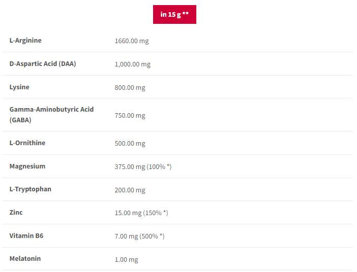 Съставът е комплексeн и включва: l-аргинин, DAA (d-аспарагинова киселина), лизин, GABA (гама-аминомаслена киселина), l-орнитин, магнезий, l-триптофан, цинк, витамин B6 и мелатонин. Както виждате, той съдържа всичко най-важно за постигане на желания ефект – дълбок и регенериращ сън.