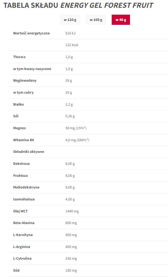 Освен това ENERGY GEL съдържа витамин B6, който допринася за намаляване на умората и магнезий, който спомага за правилното функциониране на мускулите и играе ключова роля в енергийния метаболизъм.