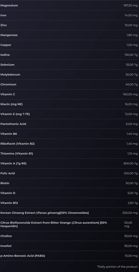 СЪСТАВ: Есенциален минерален комплекс [магнезиев оксид; магнезиев карбонат; железен фумарат; малтодекстрини; цинков сулфат; манганов сулфат; меден сулфат; калиев йодид; хромов хлорид; натриев молибдат; натриев селенат]; Метаболитни подобрители [екстракт от корейски женшен (Panax ginseng) [10% ginsenosides]; екстракт от цитрусови биофлавоноиди от горчив портокал (Citrus aurantium) [50% хесперидин]; холин битартрат; инозитол; р-амино-бензоена киселина (PABA)]; Витаминна формула [вит. C (L-аскорбинова киселина); ниацин (никотинамид); вит. E (DL-алфа-токоферил ацетат); пантотенова киселина (калциев D-пантотенат); вит. В6 (пиридоксин хидрохлорид); рибофлавин; тиамин (тиамин мононитрат); вит. А (ретинил ацетат); фолиева киселина (птероилмоноглутаминова киселина); биотин (D-биотин); вит. D (холекалциферол); вит. В12 (цианокобаламин)]; обвивка на капсулата (желатин; цветове – титанов диоксид, железни оксиди и хидроксиди, патент синьо V); средство против слепване – магнезиеви соли на мастни киселини.