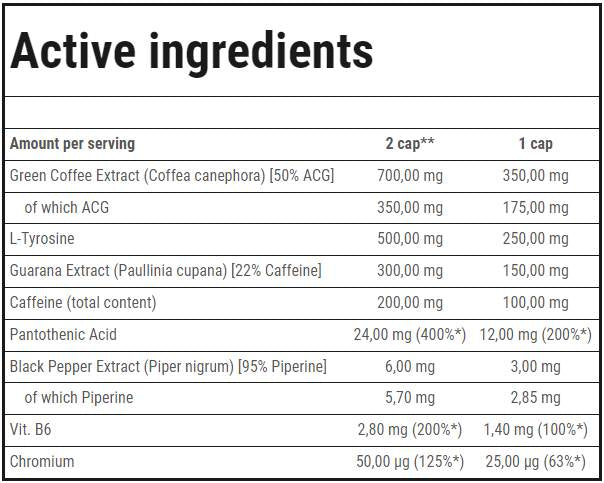 СЪСТАВ: екстракт от зелено кафе (Coffea canephora) [50% ACG]; L-тирозин; екстракт от гуарана (Paullinia cupana) [22% кофеин]; обвивка на капсулата (желатин; оцветители – железни оксиди и хидроксиди; титанов диоксид; азорубин); безводен кофеин; средство против слепване – магнезиеви соли на мастни киселини; пантотенова киселина (калциев D-пантотенат); екстракт от черен пипер (Piper nigrum) [95% пиперин]; вит. В6 (пиридоксин хидрохлорид); хром (хром пиколинат).