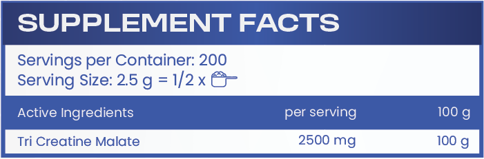 TRI CREATINE MALATE е смес от креатин монохидрат и ябълчена киселина, която увеличава силата, издръжливостта и мускулната маса без ненужни странични ефекти.