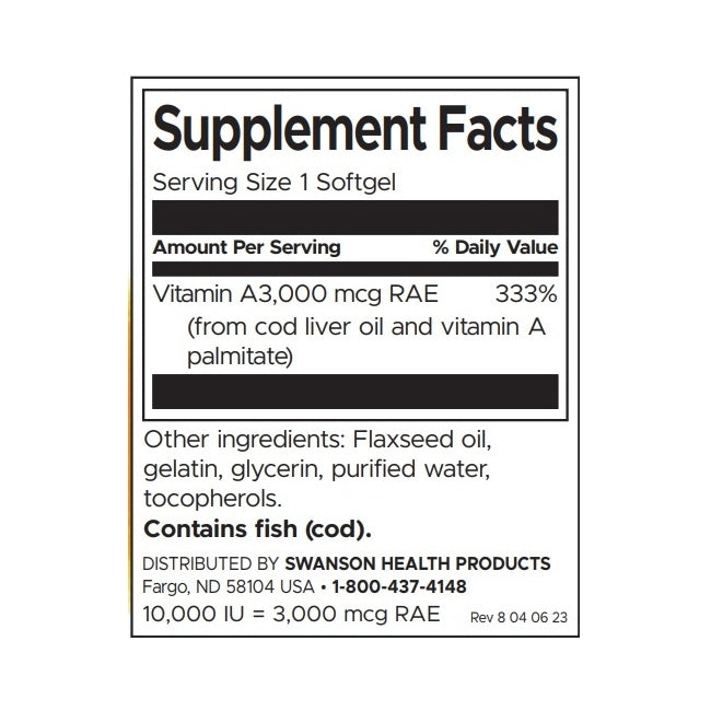 Витамин А е добре известен със своето благотворно действие, което оказва върху здравето на очите, но той е също така много важен и за здравето на кожата и функцията на имунната система. Витамин А на Суонсън е извлечен от чисто рибено масло от черен дроб.