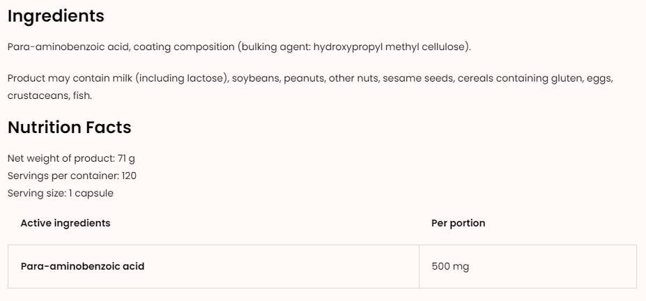 PABA (пара-аминобензоена киселина) е важен витаминоподобен компонент, който играе важна роля в поддържането на здравето на кожата и метаболизма. Този продукт осигурява 500 mg PABA на капсула, което го прави идеален за поддържане на общото благосъстояние. Приемът на PABA може да помогне за подобряване на състоянието на кожата, намалявайки риска от слънчеви изгаряния, както и да подкрепи организма в производството на фолиева киселина, която е жизненоважна за клетъчната функция и растеж.