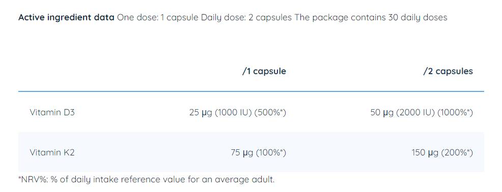 Съдържа 2000 IU витамин D3 и 150 μg витамин K2 във всяка порция. Витамин D е ключов за нормалното функциониране на организма, но през зимните месеци и при ограничено излагане на слънце естественият синтез често намалява. Комбинацията D3 + K2 подпомага използването на калций за здрави кости и зъби, като допринася за поддържането на костната здравина. Освен това може да облекчи възпаления и да подпомогне здравословната работа на черния дроб.