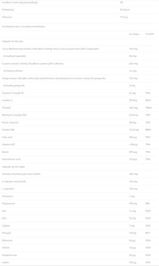 Нощен комплекс: Съдържа минерали и важни съставки като гама-аминомаслена киселина (GABA), D-аспарагинова киселина (DAA) и мелатонин, които подпомагат релаксацията и качествения сън.