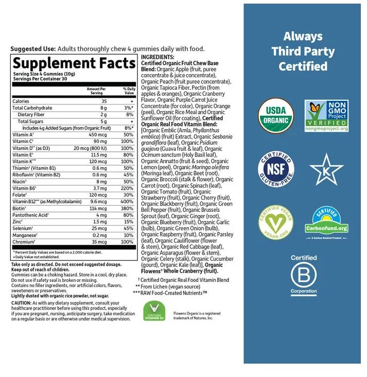 Mykind Organics | Men's Multi 40+ Gummies е истински кръстоносец на здравето, като се отказва от конвенционалните витаминни гуми, като избягва преработени захари и сиропи, изкуствени оцветители и аромати, животински продукти и ГМО. С нашата технология за чиста гума няма никакви "бонбонени" съставки, няма свински желатин или царевично нишесте. Можете да бъдете сигурни, че получавате истинска, пълноценна хранителна витаминозна плодова дъвка, която не само е полезна за вас, но е и страхотна на вкус! Те са сертифицирани за органични продукти USDA, проверени по проект без ГМО, сертифицирани вегани, сертифицирани без глутен и кошер.