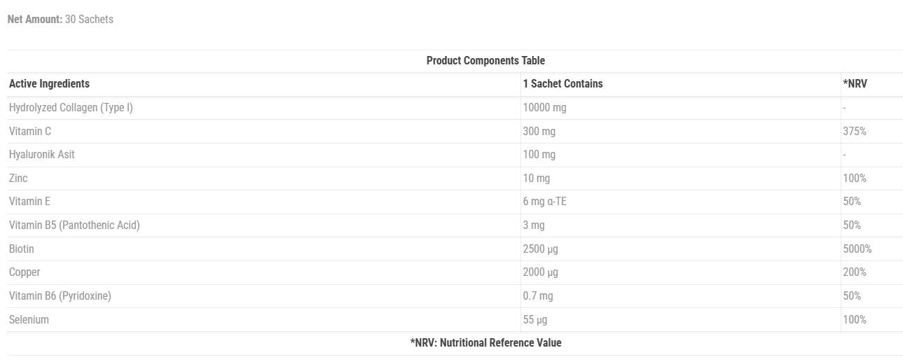 Перфектното съчетание от 10,000 mg хидролизиран колаген тип I и 100 mg хиалуронова киселина работи за еластичност и дълготрайна хидратация на кожата. Активните микроелементи биотин, цинк, мед, селен и витамин C осигуряват антиоксидантна защита и подпомагат здравословния растеж на косата и ноктите. А ананасовият вкус прави приема приятно и лесно за ежедневен режим.