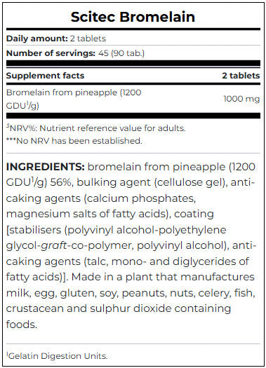 Бромелаина е един от най-биоактивните ензими, усвояващи протеина, и е обект на постоянни изследвания по целия свят. Свойства и характеристики на Bromelain от Scitec включват повишаване на имунитета, увеличаване броя на белите кръвни телца, противовъзпалително и обезболяващо действие, както и приложение след операции за по-добро заздравяване на рани. Използва се и като агент, който пречи на разреждането на кръвта и пречи на нейното съсирване.