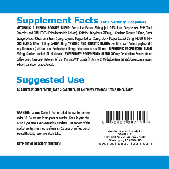 Уникалната многофазова формула на EVERBUILD усилва горенето на мазнини, ускорява обмяната на веществата и намалява задържането на вода под кожата, което спомага за по-изразени резултати. За разлика от други продукти за горене на мазнини, Ever Burn се стреми да подобри общото здравословно състояние без излишен стимул и неприятни ефекти.