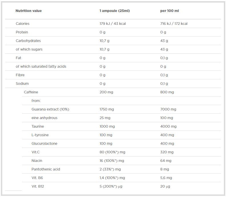 Съвкупността от активни съставки работи заедно, за да даде ясно и продължително усещане за енергия. Кофеинът от гуарана и чистият кофеин осигуряват бързо действие, докато тауринът намалява катаболните процеси в мускулите и поддържа настроението. Глюкуронолактонът повишава кислородната абсорбция и използването на енергия, а L-тирозинът подпомага предаването на сигнали за енергийна продукция до мускулните и нервните тъкани. Удобната ампулна форма позволява прецизно дозиране и комфортно приемане преди активност.