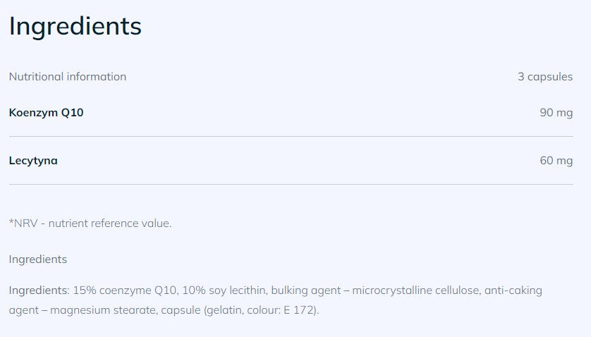 Коензим Q10 е ключов участник в енергийните процеси на организма и подпомага доставянето на енергия до сърцето, черния дроб и бъбреците. Добавеният лецитин улеснява навлизането на Q10 в клетките и подобрява усвояването, особено при активен начин на живот и с напредване на възрастта. Допълнителният прием помага за запазване на здравето и активността, като намалява отрицателното въздействие на физическото и психическото натоварване.