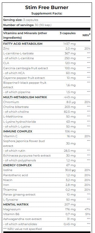 С добавени съставки като цинк, холин, хром и витамин C комплекс, Stim Free Burner подпомага нормалния метаболизъм на мазнините, липидния метаболизъм и защита на клетките от оксидативен стрес. Продуктът е подходящ за дълготраен помощник в диета и активен начин на живот, като подпомага нормалното ниво на енергия и концентрация, без да натоварва нервната система. За най-добри резултати се препоръчва комбинация с балансирана диета и редовна физическа активност. Забележка: продуктът не е подходящ за бременни и деца под 14 години.