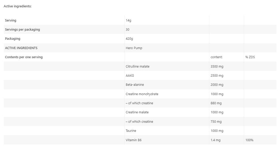 The formula is designed to induce a "pump" in the muscles, which is the result of increased blood flow. This improves not only the aesthetics, but also the efficiency of training. Hero Pump is excellent for use before training, after training or even on non-training days to maintain a constant flow of nutrients.