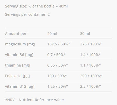 The convenient shot format is suitable for active people, athletes and anyone looking for an easy way to supplement magnesium and vitamins. Magnesium contributes to the reduction of tiredness and fatigue, to the maintenance of normal metabolism and to the health of the nervous system, while vitamin B6 contributes to the proper functioning of the nervous system and muscles. In addition, the product is enriched with other B-vitamins for overall support of the immune and nervous systems.