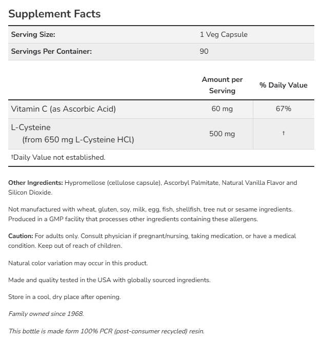 NOW Foods L-Cysteine ​​500 mg is a dietary supplement in tablet form (or vegan capsules, depending on the variant) that contains L-cysteine, a sulfur-containing amino acid. This formula is supplemented with vitamins C and B6 to support metabolism, antioxidant protection, and skin, hair, and nail health.