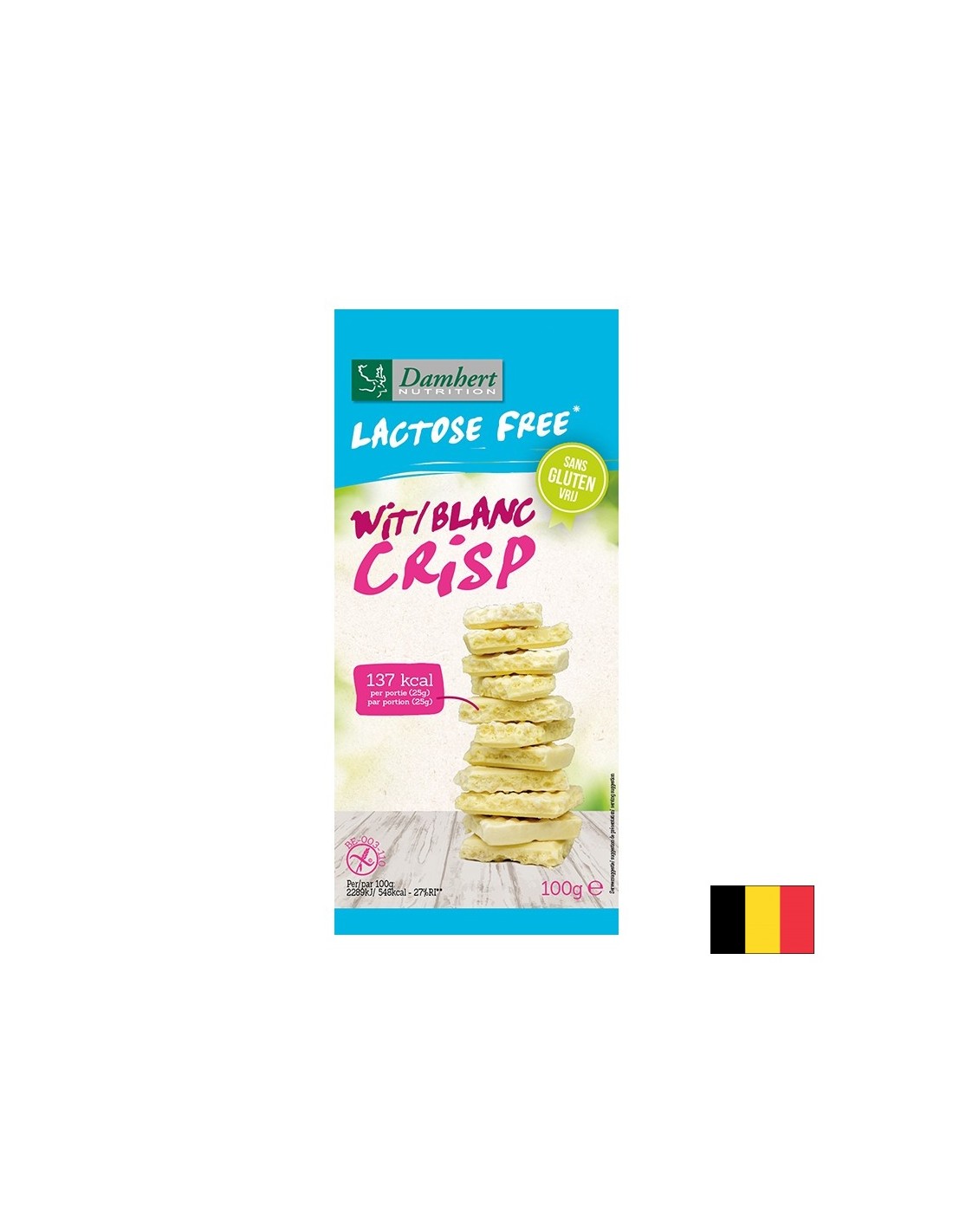 Wit/ Blanc Crisp Lactose free, sans gluten / Rice crisp with white chocolate (gluten and lactose free), 100 grams is a refined sweet dessert, combining the crunchiness of rice crisp with the finesse of white chocolate. This product is specially developed for people who want to enjoy a delicious treat without worrying about the lactose and gluten content.