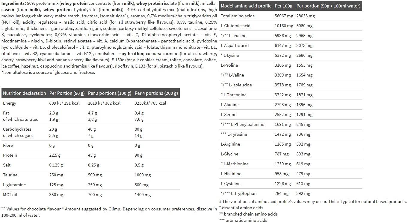 The product is supplemented with medium-chain triglycerides (MCT), glutamine, taurine, metabolism boosters, vitamins and minerals. The complex action of the ingredients is aimed at increasing lean muscle mass and strength.