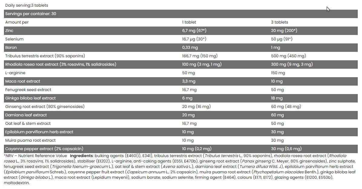 Cortisol regulation - reducing stress and adapting the body are important elements in maintaining high testosterone. The complex that takes care of this includes the powerful adaptogenic herbs Rhodiola, Ginseng and Maca;
