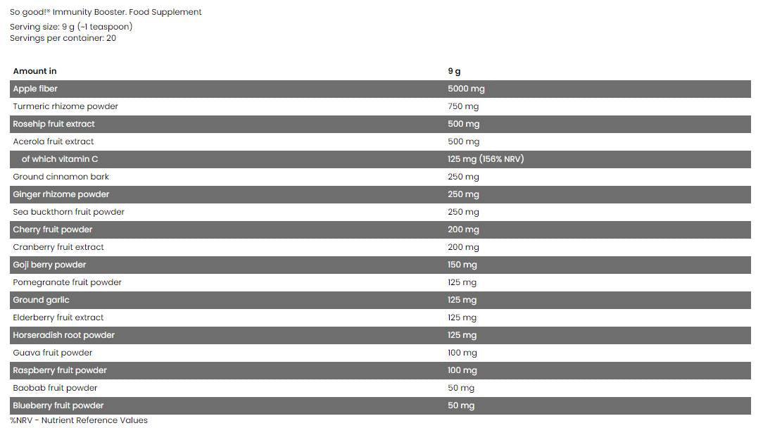 IMMUNITY BOOSTER is a unique combination of fiber, fruits, spices and vegetables - the combination of ingredients can be extremely valuable in the daily diet. The composition of the dietary supplement uses only natural ingredients with a potentially beneficial effect on maintaining immunity. The formula of the supplement does not contain any dyes. The product is developed for lovers of balanced nutrition. It is an ideal solution during the autumn-winter season, which is associated with reduced immunity and a greater risk of infections.
