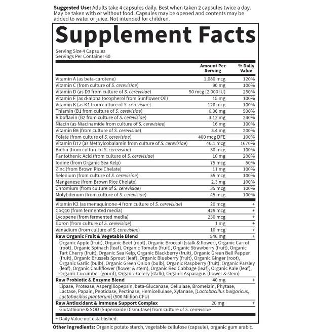 Made with individually “grown” nutrients through probiotic cultivation to produce nutrients created from RAW foods, Vitamin Code supplements are delivered in a whole food base of fruits and vegetables. Vitamin Code supplements are RAW, which not only means they are produced below 115º F, but it also means these nutrients come with their natural cofactors, along with live probiotics and enzymes, just like raw foods! Vitamin Code’s raw powders are delivered in capsules with no binders or fillers – everything you want and nothing you don’t.