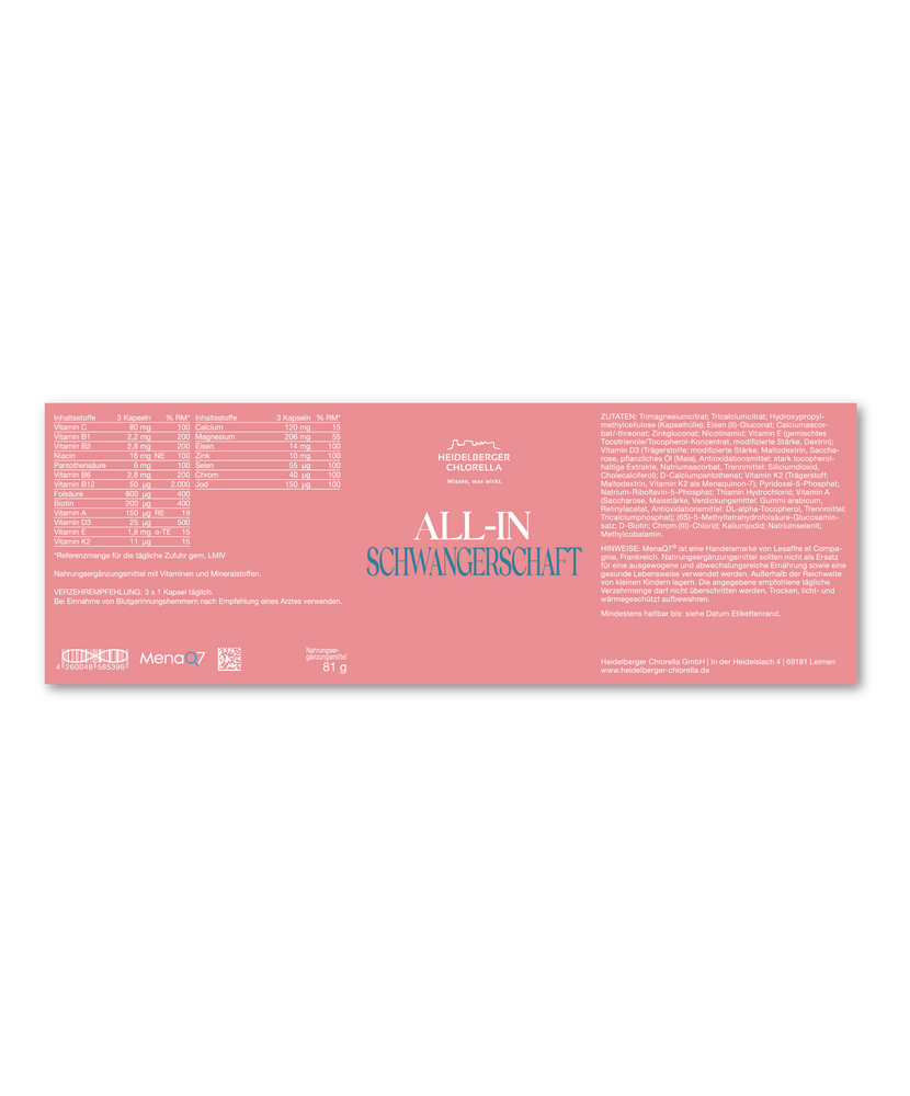 Meet PREGNANCY - ALL–IN SCHWANGERSCHAFT - a nutritional supplement specially designed to provide the necessary vitamins and minerals to expectant mothers. With 90 capsules in the package, this product is the ideal helper during pregnancy planning, during pregnancy itself and during the breastfeeding period.