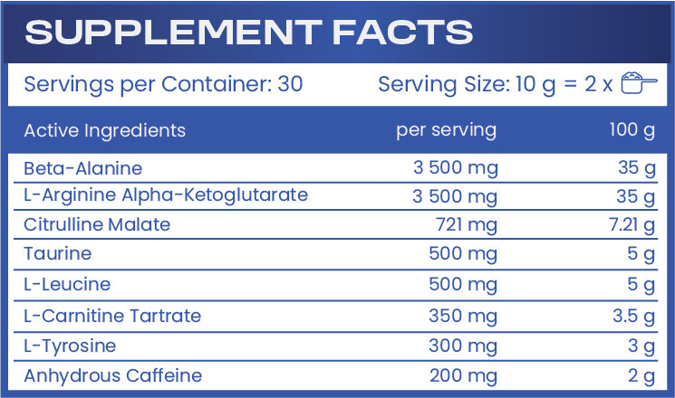Built to support long-lasting muscle performance, SUPER PUMP uses a carefully selected combination of active ingredients such as AAKG, Beta Alanine, Citrulline Malate and L-Leucine, which improve the transport of nutrients to muscle cells and support growth. The formula also increases growth hormone synthesis and regulates blood pressure, which can contribute to a more effective workout and a clearer build of lean muscle mass.