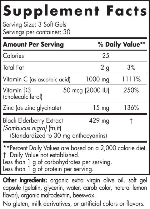 A blend of standardized elderberry, essential vitamins D3 and C and zinc glycinate;
