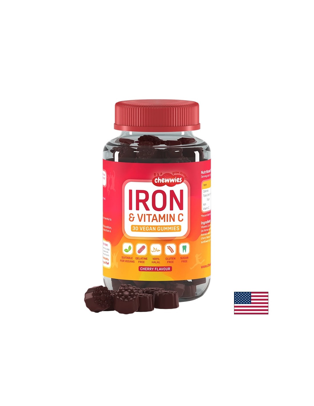 Iron with Vitamin C Chewies is a great solution for people who do not want or have difficulty taking capsules or tablets. The easy-to-take jelly tablets have a pleasant cherry flavor. Each jelly tablet contains 5 mg of ferrous sulfate and 40 mg of vitamin C (L-ascorbic acid) for a strong immune system, optimal cognitive function and the formation of hemoglobin and red blood cells.