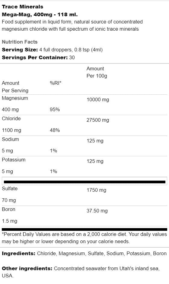 Discover the power of Mega-Mag 400 mg - your ideal health and fitness support! With 400 mg per serving, this moral/ionic magnesium is the perfect source of magnesium, ensuring rapid absorption and maximum effectiveness. With the unique ConcenTrace formula, Mega-Mag Liquid Magnesium offers not only magnesium, but also a wealth of minerals and trace elements that act as natural cofactors.
