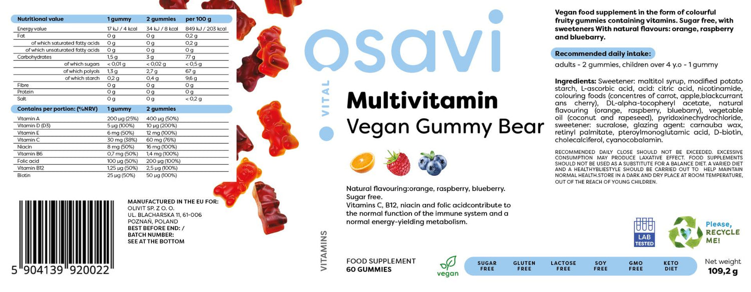 Multivitamin Vegan Gummy Bear | Orange, Raspberry, Blueberry - 60 gummy candies