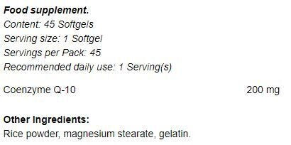 Ingredients: Coenzyme Q10, rice powder, magnesium stearate, gelatin