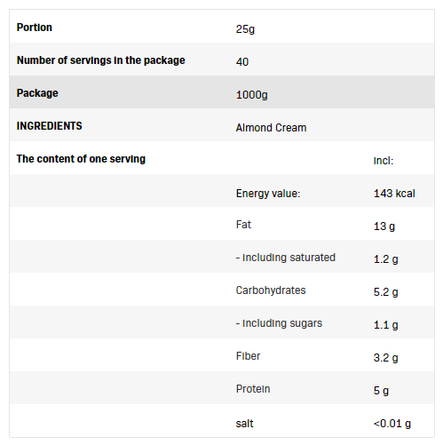 Packaging: 500 g or 1000 g, suitable for home use or longer supply. It is a source of protein and fiber, gluten-free, lactose-free, no added sugars and non-GMO, making it suitable for various diets and nutritional regimes. The cream supplies essential fatty acids, vitamin E and vitamin B1, supporting general well-being and recovery after training.