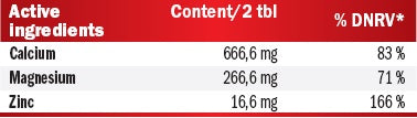The combination of calcium, magnesium and zinc ensures optimal absorption and supports bone density, muscle function and immune response. Calcium plays a key role in building and maintaining healthy bones and teeth, magnesium is involved in energy metabolism and cell regeneration, and zinc contributes to collagen formation and normal enzyme function.