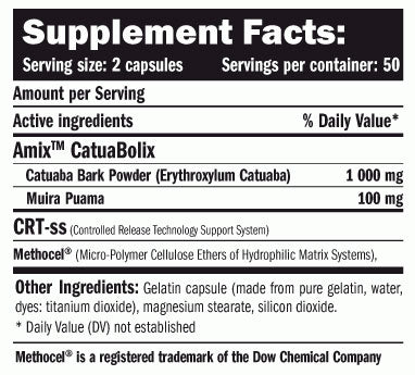 Catuaba and Muira Pauma are ancient aphrodisiacs used by Brazilian tribes for centuries. CatuaBolix combines their action with modern technology, including Methocel CRT-ss (sustained release) for a longer lasting effect. This makes the product suitable for daily use and to support athletic performance and general vitality.
