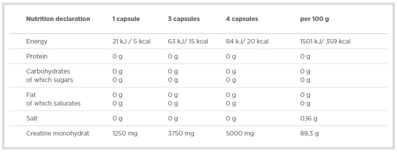 Creatine monohydrate is bound to creatine phosphate, from which ATP is produced - the main source of energy during high-intensity exercise. One dose contains 1250 mg of creatine per capsule, providing a high concentration in one dose for a more effective increase in energy and strength. The product supports muscle growth, improves endurance and supports focus and concentration during training. It is suitable for both bodybuilding and strength-technical disciplines, as well as for endurance sports, where a higher level of energy is required.